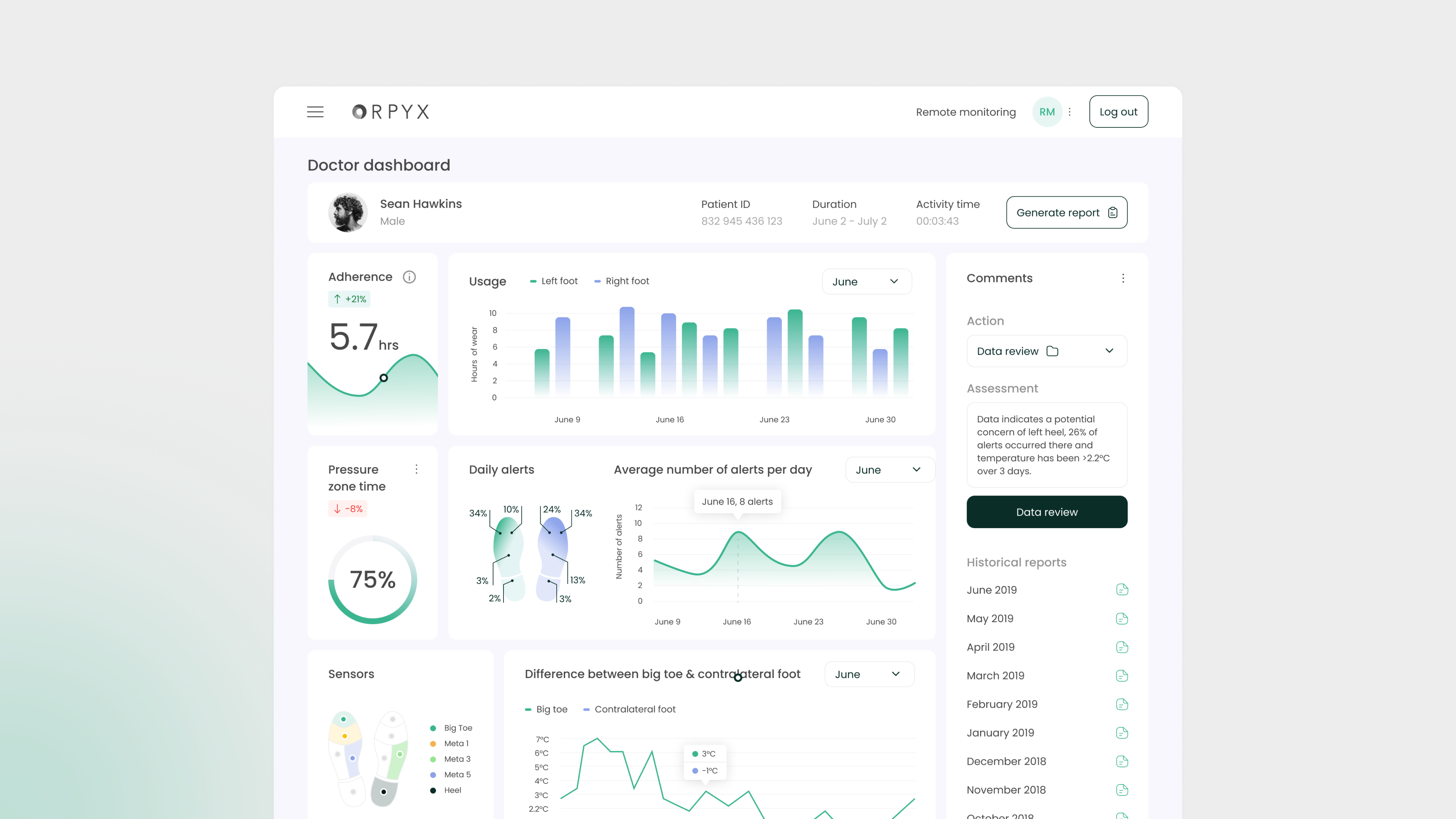 The doctor is provided with clear and detailed reports about daily activity, temperature, and pressure changes that affect the patient and can make notes of this.