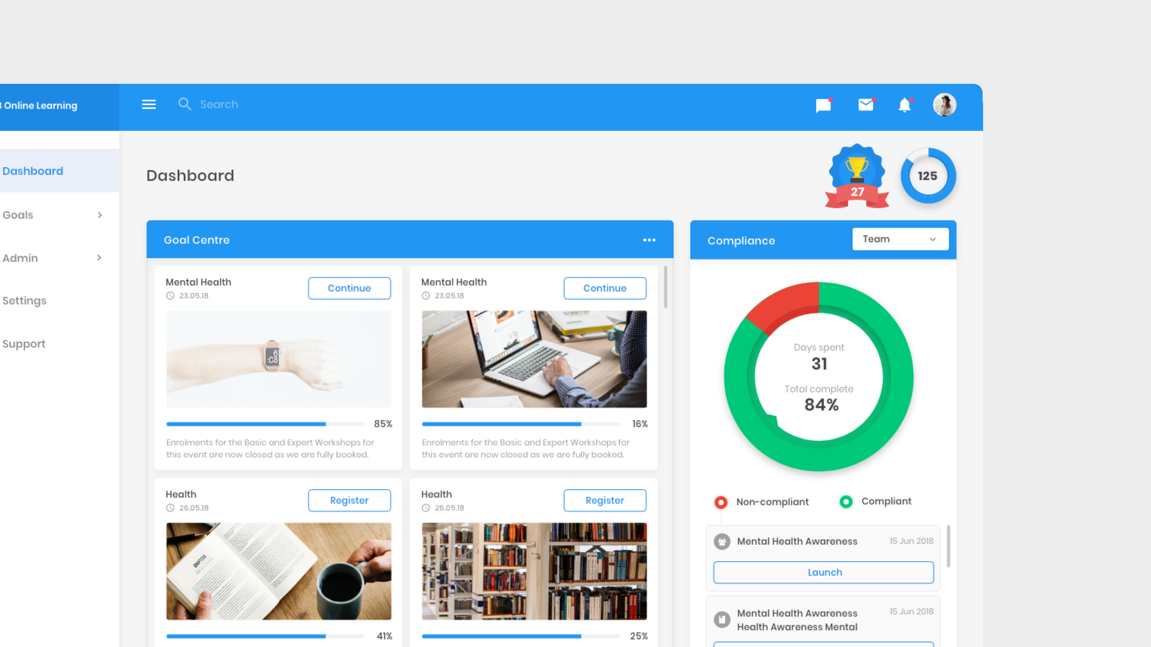 The platform has its interactive dashboards that provide users and managers with their profiles information, their teams, classes, and rewards. This easy-to-use dashboards allow to get news and notifications and perform actions from a personal toolbar.